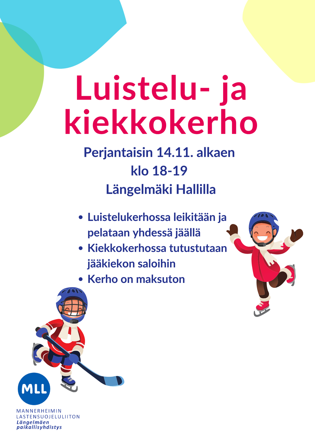 MLL:n maksuton luistelu- ja kiekkokerho perjantaisin 14.11. alkaen klo 18-19 Längelmäki Hallilla (Jykintie, 35400 Längelmäki).